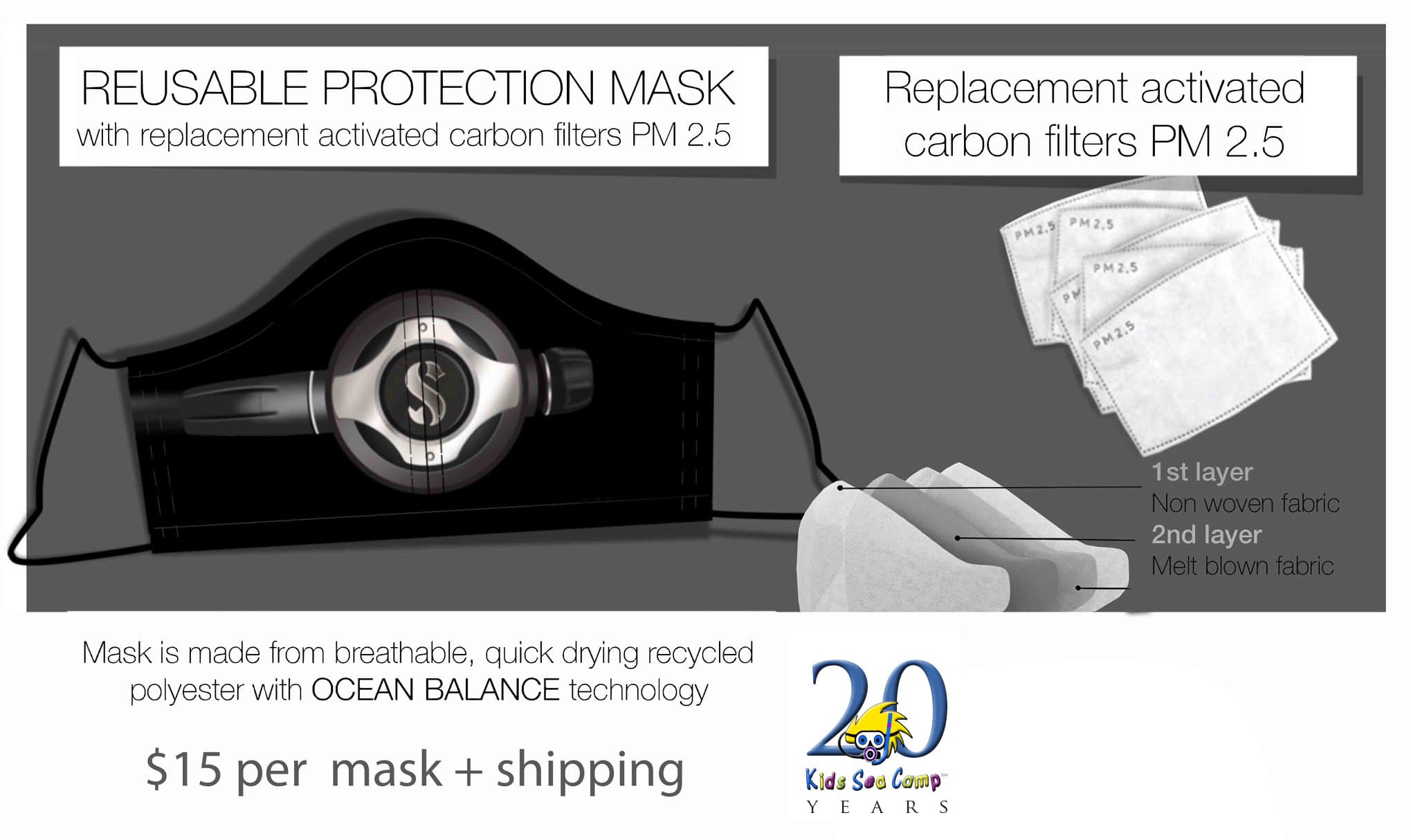 Eco-friendly fabric face masks are dual-layered, reusable and have a filter pocket for the included five PM 2.5 carbon filters – which are standardized & can be purchased through Kids Sea Camp. The sustainable cloth face coverings are two layers of polyester that can be washed in the washing machine. An earth-friendly alternative to face masks, they are made with fabric from recycled plastic bottles.